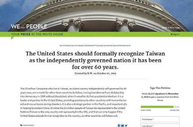 청원발표 후 30일 이내에 10만 건의 서명을 모으면 미국정부에게 답을 얻을 조건이 충족된다. ‘미국은 대만이 60년 넘게 독립국가로 이어온 것을 정식으로 승인해야 한다’는 주제의 서명은 지난 7일부터 시작됐다. 11일엔 2만 건 미만이었지만 보도와 누리꾼들을 통해 알려지게 되면서 12일부터 13일까지 서명 수를 크게 늘렸다. 10만 건 돌파 이후에도 서명은 계속 증가하고 있어 기한인 다음달 6일까지 더 늘어날 것으로 보인다.