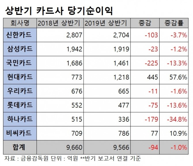 16일 금융감독원과 업계에 따르면 신한·국민·삼성·현대·우리·롯데·하나·롯데카드 등 8개 카드사의 올 상반기 순이익은 9566억 원으로 지난해 같은 기간에 비해 1.0% 감소했다.