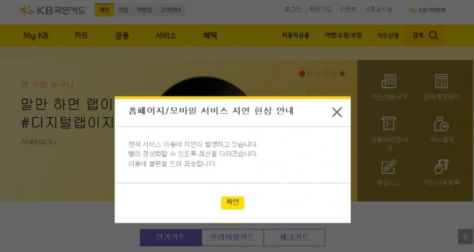 이미지 확대보기국민카드는 16일 홈페이지·모바일 서비스의 지연 현상 안내를 통해 "현재 서비스 이용에 지연이 발생하고 있다"며 "빨리 정상화할 수 있도록 최선을 다하겠다"고 공지했다.