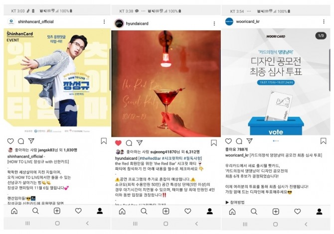 다른 카드사들도 앞다퉈 '인스타그램'을 회사 이벤트나 마케팅에 활용하기는 마찬가지다. 우리카드는 최근 '카드의 정석 댕댕냥이' 신용카드 디자인을 공모를 통해서 뽑았는데, 당시 최종 후보에 오른 디자인 6점에 대해 인스타그램에서 이벤트를 했다.