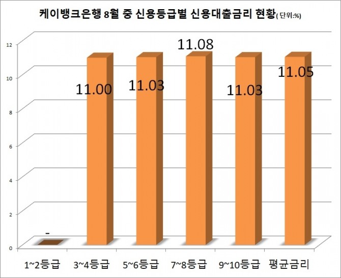 이미지 확대보기8일 은행연합회 대출금리비교 공시에 따르면 9월 공시된 케이뱅크의 일반신용대출 평균금리는 11.05%다. 이는 8월 공시 평균금리 10.76%보다 0.29%포인트 오른 것으로 대부분의 은행은 3~6%대인 것과 비교하면 높은 금리 수준이다.