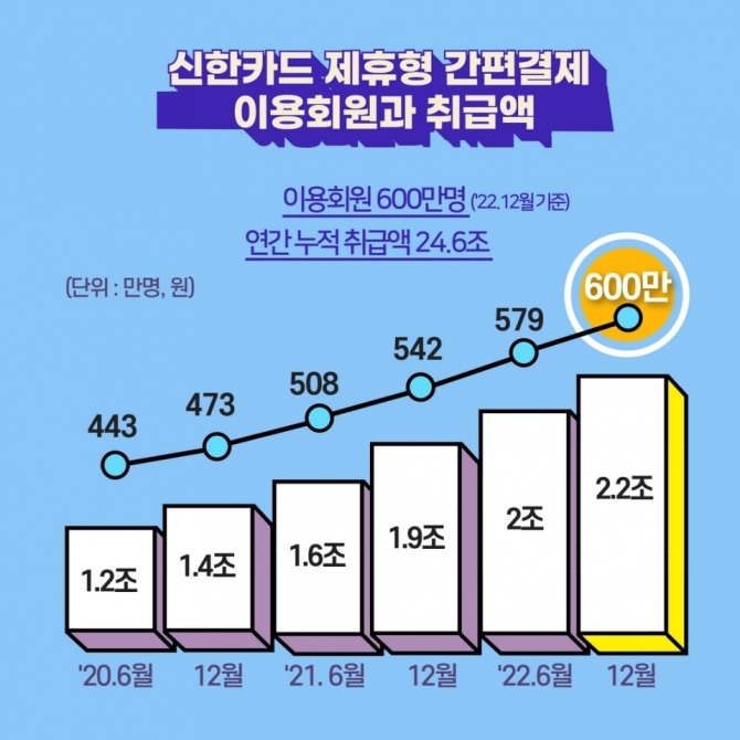 신한카드 간편결제 이용회원은 2020년 12월 한 달간 약 473만 명 수준에서 불과 2년 만에 30%에 가까운 신장률을 기록하며 600만 명을 돌파하는 등 가파른 성장세를 보이고 있다.