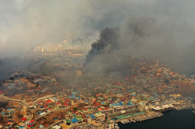 특히 강릉 옥계에서 난 불이 동해로 급속하게 번지면서 도심이 시커먼 연기로 뒤덮여 있다.