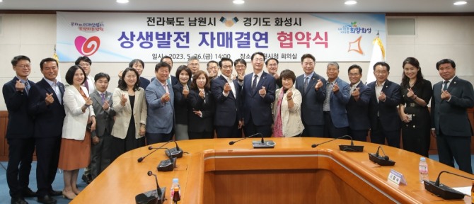 이미지 확대보기이날 협약식은 화성시의회 김경희 의장, 오문섭 부의장, 기획행정위원회 이은진 위원장, 박진섭, 김영수, 김종복, 배현경 의원을 비롯한 정명근 화성시장, 최경식 남원시장, 전평기 남원시의회 의장 등 총 24명이 참석했다.