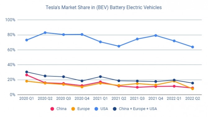 2020년 2분기 기준 25.1%였던 테슬라의 글로벌 BEV 시장점유율은 올 2분기 현재 15.6%로 준 것으로 집계됐기 때문이다. 2년 사이 점유율이 9.5% 감소한 셈이다.