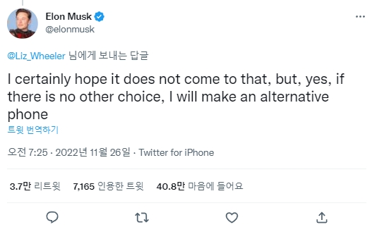 미국 정치평론계의 보수논객이자 팟캐스트 진행자인 리즈 휠러가 이날 올린 트윗에서 “만약 애플과 구글이 트위터를 자신들의 앱스토어에서 쫓아낸다면 머스크가 독자적으로 스마트폰을 만들어야 한다고 본다”면서 “그렇게 되면 미국 국민의 절반이 아이폰과 안드로이드폰을 버리고 머스크가 만든 스마트폰으로 갈아탈 것”이라고 주장하자 이에 댓글을 다는 형식으로 아이폰과 안드로이드폰에 맞설 스마트폰을 개발할 생각이 있다고 밝혔기 때문.