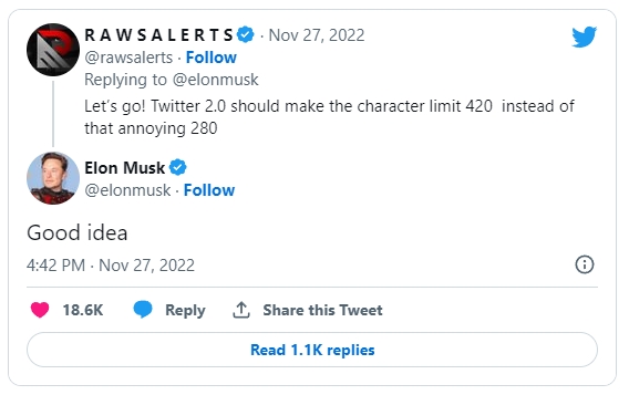 아직 작업이 진행 중이라 구체적인 예상은 어렵지만 머스크는 1000자로 늘리는 방안을 적극적으로 고려 중임을 시사했다.
