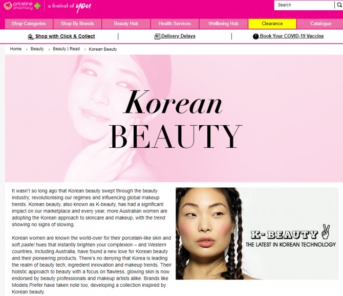 호주 최대 드럭스토어 홈페이지에 게재된 K-beauty 기사