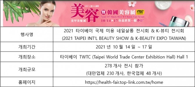 올해 타이베이 국제 미용 네일살롱 전시회에는 K-뷰티 전시회 구역이 추가돼 한국 기업 48개사가 참가했다. 코로나19로 인해 한국기업들이 전시회에 직접 참가하지는 못했지만 샘플을 전시하고 대만 바이어와 화상상담을 진행하는 등 대만 뷰티시장에 대해서 간접적으로나마 체험하고 진출방법을 모색해볼 수 있는 자리였다.