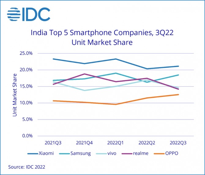 IDC는 3분기 인도의 스마트폰 생산량은 4300만대로 전년 동기 대비 10% 줄었다고 밝혔다. 이는 2019년 3분기 이후 가장 적은 규모다.