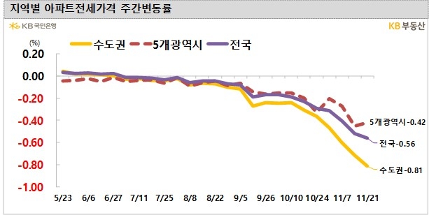 이미지 확대보기24일 KB부동산이 발표한 주간 주택시장 동향에서 이번 주 서울 아파트 전세가격이 전주대비 0.75% 하락했다고 밝혔다.