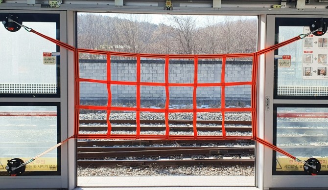 안전망은 강력압착기 4개가 800㎏ 이상 무게를 견딜 수 있도록 안전문 강화유리에 고정돼 작업자를 보호한다. 간편하게 탈부착이 가능해 출입문이 열릴 때 바로 떼어내 승객 승하차할 수있도록 고안했다.