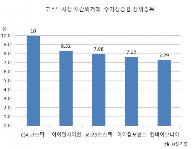 24일 한국거래소에 따르면 CSA코스믹은 전날 장 마감후 이어진 시간외거래에서 10% 상승해 상승률 1위를 기록했다.