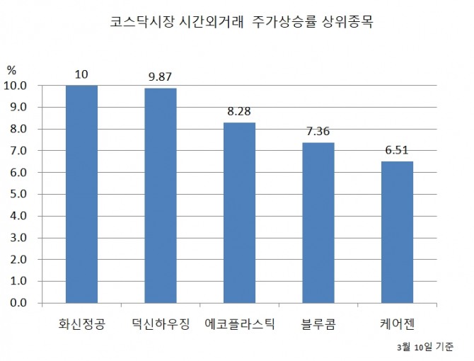 표기 순서는 상승률 순위, 종목명, 10일 시간외 종가, 시간외거래 주가 상승률 순이다.