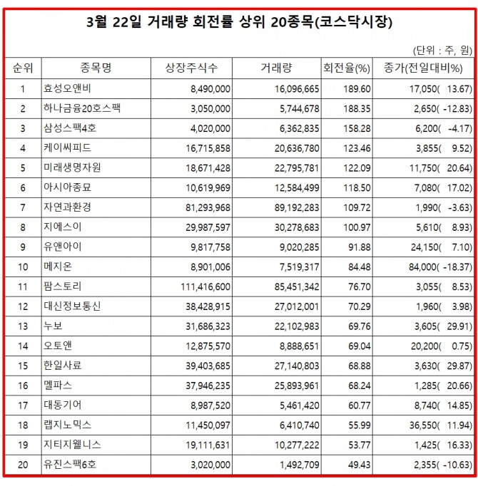 22일 주식시장에서 코스닥 종목의 거래량 회전률 기준 상위 종목은 다음과 같다.