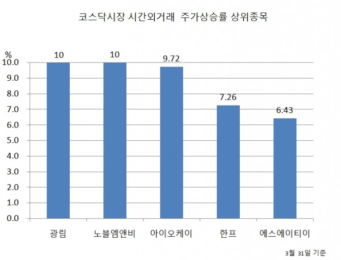 다음은 지난달 31일 코스닥 시장 시간외거래 주가상승률 상위 종목이다.