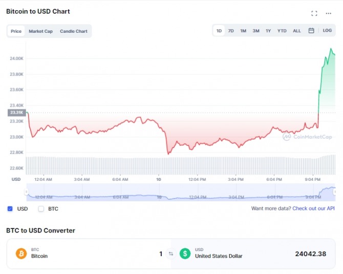 이미지 확대보기암호화폐 전문매체 크립토포테이토는 10일(현지시간) 비트코인은 미국이 소비자 물가 지수(Consumer Price Index) 지표에서 소폭 하락을 발표하면서 단 몇 분 만에 약 1000달러 급등해 2만4000달러를 돌파했다고 보도했다.