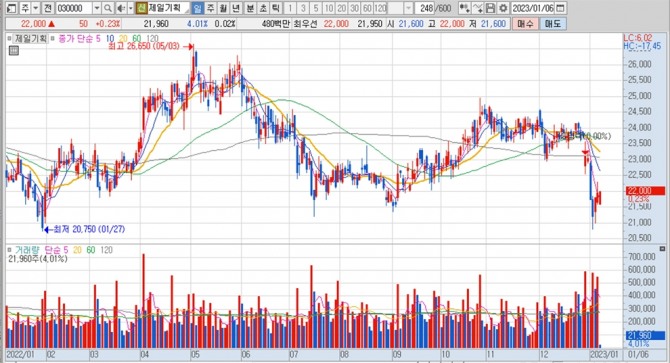 이미지 확대보기제일기획의 주가는 6일 오전 9시 40분 현재 전일보다 50원(0.23%) 오른 2만2000원에 거래되고 있습니다.