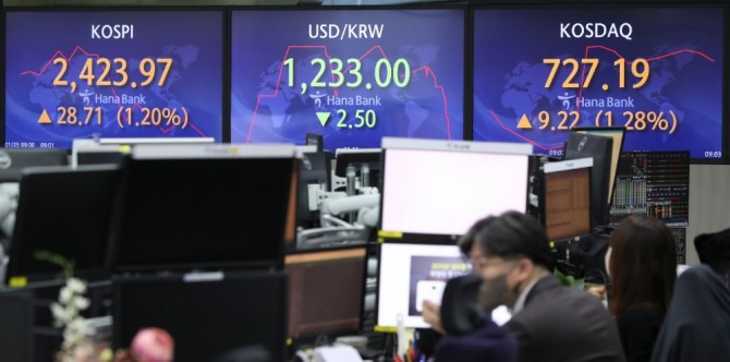 장중 한때 2430선까지 넘어섰다. 코스피가 2430선을 터치한 것은 지난달 5일 이후 처음이다.