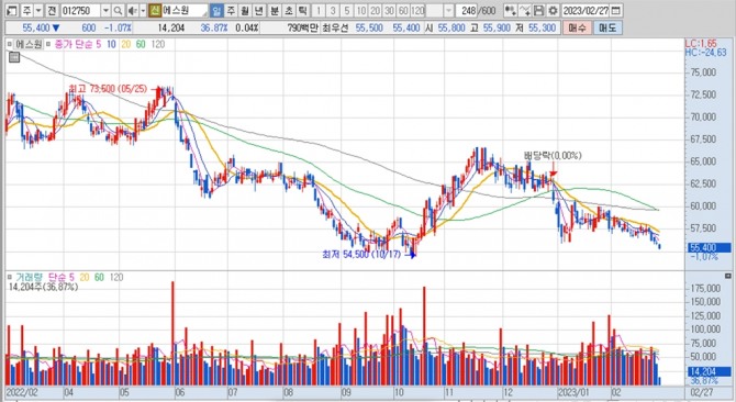 이미지 확대보기에스원의 주가는 27일 오전 9시 40분 현재 전일보다 600원(1.07%) 내린 5만5400원에 매매되고 있습니다.