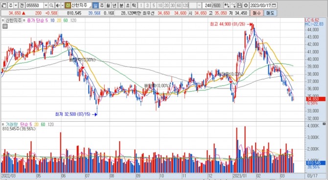 이미지 확대보기신한지주의 주가는 17일 오전 10시 40분 현재 전일보다 200원(0.58%) 오른 3만4650원에 거래되고 있습니다.