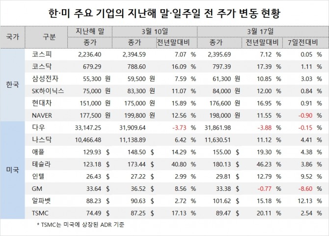 현대자동차의 주가는 17만6600원으로 일주일 새 0.91% 올랐고 지난해 말에 비해서는 16.95% 상승했습니다. 네이버의 주가는 19만8000원으로 일주일간 0.90% 떨어졌고 지난해말보다 11.55% 올랐습니다.