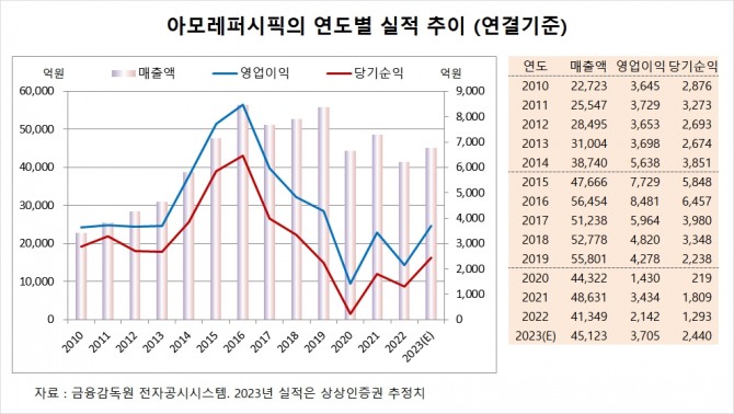 아모레퍼시픽은 지난해 연결기준 매출액이 4조1349억원, 영업이익이 2142억원, 당기순이익이 1293억원으로 집계됐습니다.