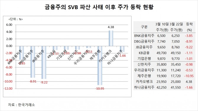같은 기간 코스피 지수는 SVB 사태가 발생하기 직전인 3월 10일 2394.59에서 3월 22일 2416.96으로 0.93% 올라 SVB 사태 영향에서 서서히 벗어나는 분위기입니다.