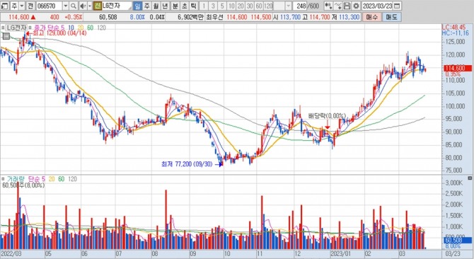 이미지 확대보기LG전자의 주가는 23일 오전 9시 10분 현재 전일보다 400원(0.35%) 오른 11만4600원에 매매되고 있습니다.