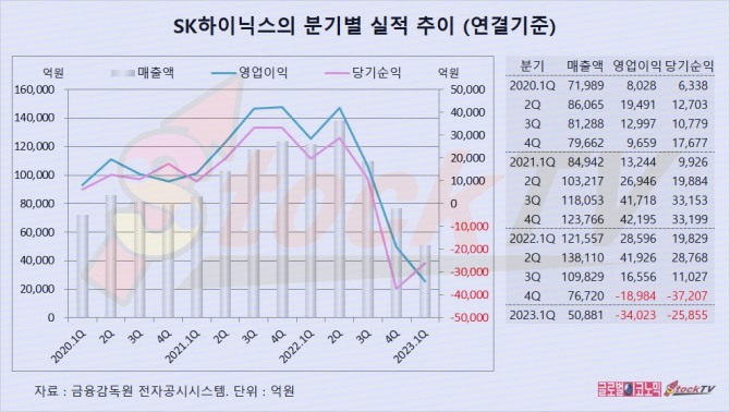 SK하이닉스는 2023년 1분기 연결기준 영업이익이 -3조4023억원, 당기순이익이 -2조5855억원으로 각각 전년동기 흑자에서 적자로 전환했습니다.