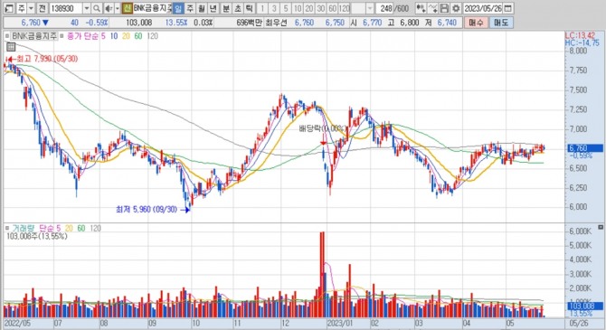 DS투자증권 나민욱 연구원은 BNK금융지주가 지난 3월 매입 완료한 자사주 약 160억원 상당을 하반기 전량 소각할 계획이어서 2023년 예상 주주환원율이 27.7%, 배당수익률은 10.0%로 예상되고 하반기 중간배당 도입 추진 및 향후 분기배당 검토 등 주가 제고 노력이 돋보인다고 평가하고 있습니다.