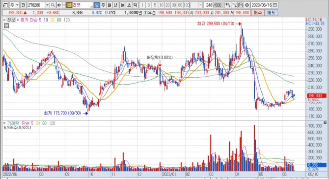 이미지 확대보기천보의 주가는 16일 오전 9시 15분 현재 전일보다 1300원(0.66%) 오른 19만8300원에 매매되고 있습니다.