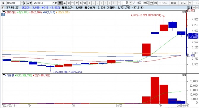 이미지 확대보기17일 한국거래소에 따르면, 이날 정규 거래에서 코리아나는 7.6% 하락한 3830원에 거래를 마감했지만, 이어진 시간외 거래에서 오후 5시 30분 현재 8.62% 상승한 4160원에 거래되고 있다.