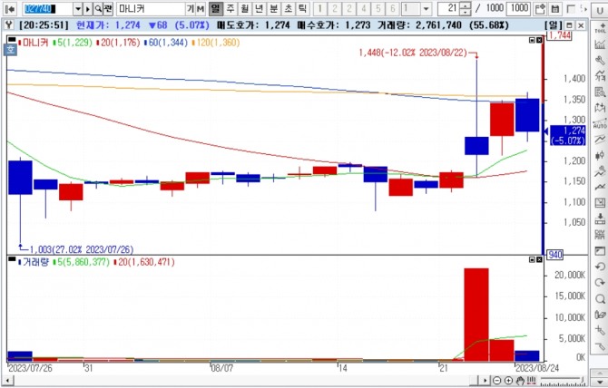이미지 확대보기24일 한국거래소에 따르면, 이날 정규 거래에서 마니커는 5.07% 하락한 1274원에 거래를 마감했지만, 이어진 시간외 거래에서 9.97% 상승한 1401원에 거래를 마쳤다.