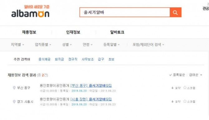 이미지 확대보기글로벌이코노믹이 지난 21일 한 아르바이트 구직사이트 채용공고를 검색해 본 결과 ‘부산 동구 줄서기 알바 모집, 시흥 장현 줄서기 알바 모집’이라는 제목으로 한 공인중개업소가 올린 아르바이트 모집 글 2건이 확인됐다. 금융결제원의 아파트투유 확인 결과 해당 분양단지는 각각 두산건설이 부산 중구 범일동에서 분양한 ‘두산위브더제니스 하버시티’와 동원개발이 경기도 시흥시 장현동에서 분양한 ‘시흥장현 동원로얄듀크 2차’였다.