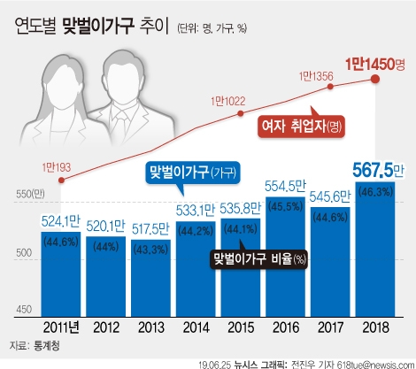 맞벌이 부부의 비중은 2013년 42.9%, 2014년 43.9%, 2015년 43.9%, 2016년 45.5%, 2017년 44.6%를 나타내다가 지난해에는 역대 최고로 높아진 것으로 분석됐다.