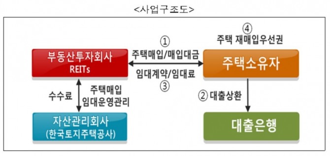 LH는 부동산투자회사의 자산관리회사(AMC)로 주택매입, 임대운영, 청산업무를 담당하며, 전국소재 아파트 500가구를 사들여 가계부채 조정, 한계차주의 주거안정을 지원한다.