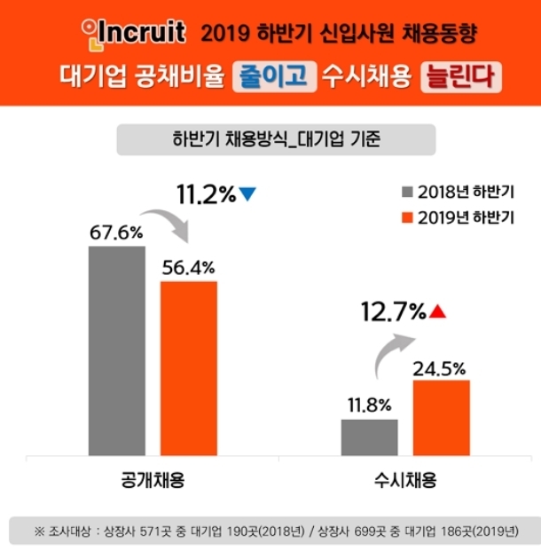 하반기 기업 규모별 수시채용 계획은 대기업 24.5%, 중견기업 26.3%, 중소기업 37.8% 순으로 확인됐는데, 작년 하반기 대기업 수시채용 비율은 11.8%였다.
