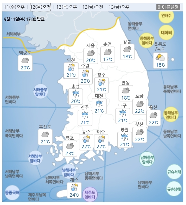 12일 아침 기온은 16~23도(평년 15~20도), 낮 기온은 21~27도(평년 24~28도)이며 13일 아침 기온은 13~21도(평년 14~20도), 낮 기온은 23~30도(평년 24~27도)도 예보됐다.