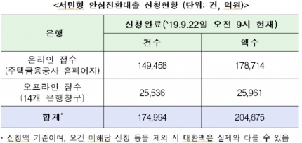 이미지 확대보기금융위원회는 22일 오전 9시 현재 안심전환대출 신청액은 20조4675억 원으로 집계됐다고 밝혔다. 신청건수는 17만4994건이다.