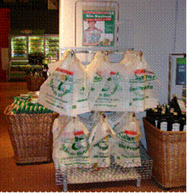 - 매장에서 판매되는 바이오 쇼핑백 제품은 감자 녹말(전분)을 주원료로 해 제작된 것으로 부패 과정을 통해 자연적으로 폐기 처분이 가능하기 때문에 별도의 소각 처리 과정을 필요로 하지 않고 바이오 가스용 발전 설비에도 유용하게 사용될 수 있는 친환경적인 제품임.