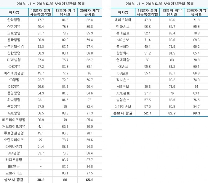 이 같은 상황은 손보업계에서도 나타났다. 손해보험사의 지난해 말 기준 13회차 계약유지율은 평균 82.7%를 기록했다. 2017년 상반기 82.6%에서 2018년 상반기 82.9%로 소폭 올랐다가 다시 하락세를 보이고 있다. 25회차를 보면 2017년 상반기 72.6%, 2018년 상반기 69%, 2019년 상반기 68.3%로 지속해서 낮아지고 있다.