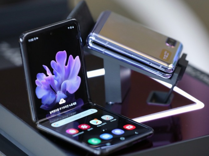 삼성전자의 Z플립은 단순히 화면이 커졌을 뿐 아니라 위·아래 화면이 분할되는 플렉스 모드가 작동돼 90도로 화면을 세워 ‘셀피’를 찍을 때 더욱 안정적인 포즈와 촬영을 감행할 수 있다.