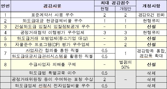 개정안에서는 벌점 경감 사유 중 교육 이수·표창 수상·전자 입찰 비율 항목이 빠지고, 표준 계약서 사용 비율과 하도급대금 직접 지급 요건이 바뀐다.