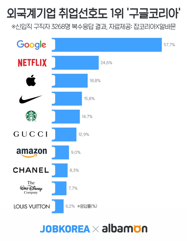 성별로는 남녀 모두 1위에 구글코리아(남 60.1%, 여 55.4%)를, 2위에 넷플릭스코리아(남 23.1%, 여26%)를 꼽았다.