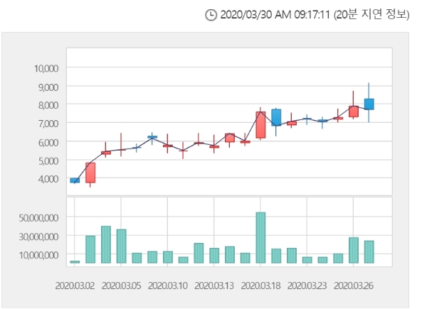 이미지 확대보기30일 한국거래소에 따르면 진원생명과학 주가는 이날 오전 9시 13분 현재 전거래일 대비 15.18% 오른 8830원에 거래되고 있다.