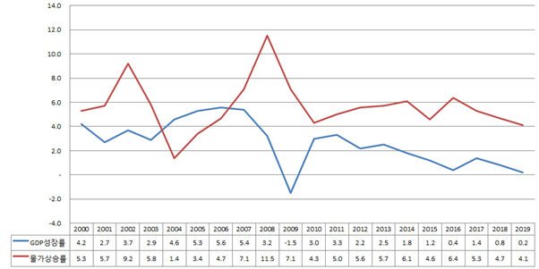 - 특히 2020년 1분기에는 2분기 연속 마이너스 성장을 기록하는 경기침체(recession)로 돌입했으며, 2020년 1% 이하의 경제성장률을 기록할 것으로 전망
