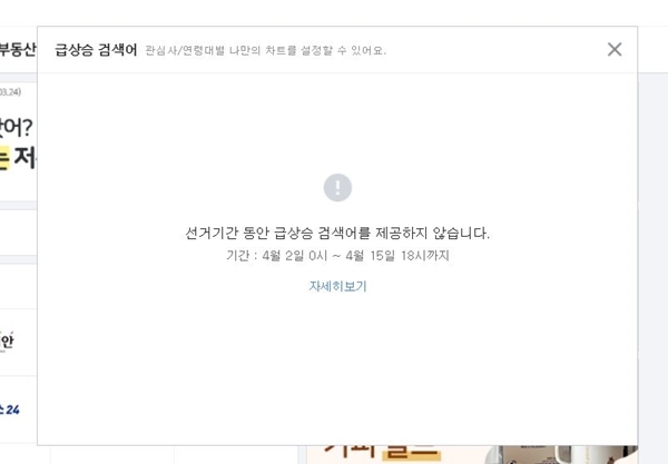이미지 확대보기일단 네이버는 이날 자정부터 15일 오후 6시까지 실시간 급상승 검색어 서비스를 중단한다. 현재 실시간 검색어 기능은 사라진 상황이다. 네이버는 "국민 대다수의 관심사가 선거라는 큰 현안에 집중된 상황에서 공정성 영향을 줄 사안 발생 가능성을 차단하기 위함"이라고 정책 변경 사유를 밝혔다.