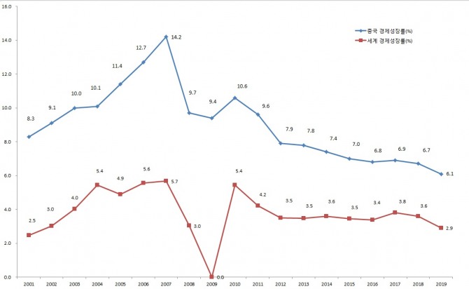 2008년 글로벌 금융위기 전후 중국과 세계의 경제성장률 비교