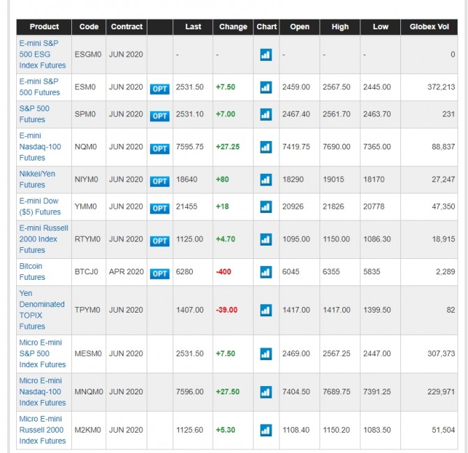 E-mini S&P 500 Futures ESM0 JUN 2020 JUN 2020 2527.75 +3.75 2459.00 2567.50 2445.00 372,331
